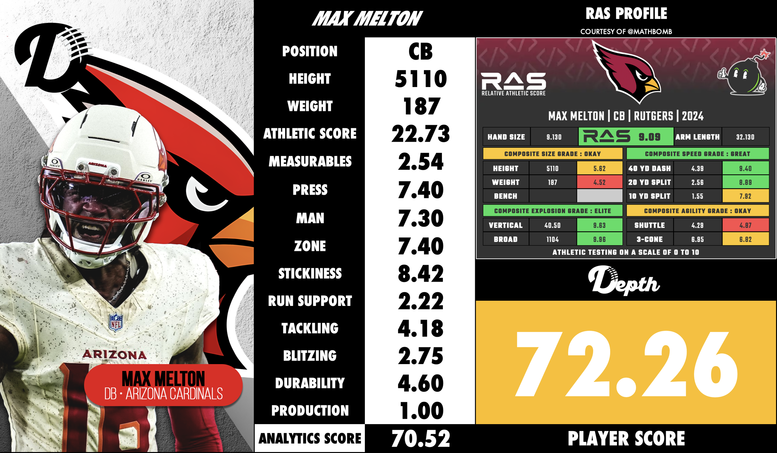 Max Melton projects as a long-term starting cornerback in the NFL who can contribute in multiple coverages and roles. His elite athletic traits and press-man ability make him a great fit for teams that value physicality and man-coverage downfield, but he’s also effective in zone given his coverage IQ and instincts. In the Arizona Cardinals defense, he has high upside to start on the boundary or potentially rotate inside, depending on scheme. While his tackling and technique need refinement, his upside as a playmaker and his growth trajectory (from raw talent to polished asset) give him a promising outlook. With continued coaching, he could grow into a high-variance, high-impact CB capable of generating turnovers while holding his own in coverage.