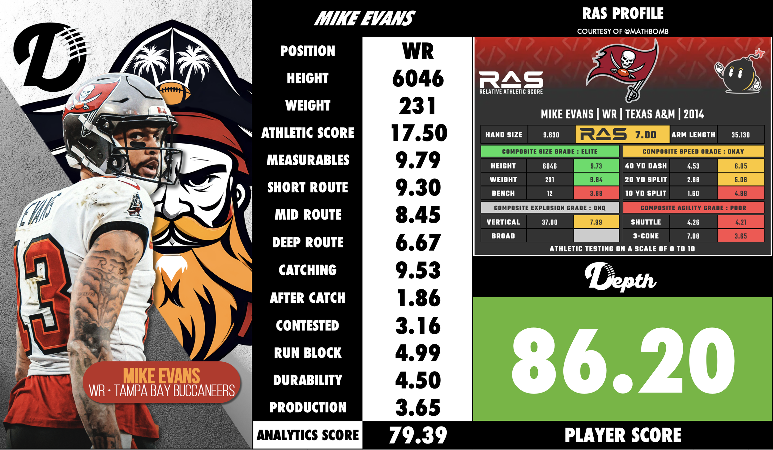 Looking ahead, Evans remains extremely valuable. Despite his veteran status, his consistency and big-play upside give him a solid floor as a No. 1 or complementary receiver. If he maintains his physicality and stays healthy, he could continue producing at a high level for several more seasons. As his game ages, he may lean more on technique, positioning, and red-zone usage rather than pure vertical dominance, but his track record suggests he can remain a focal offensive piece and a trusted target in key situations.