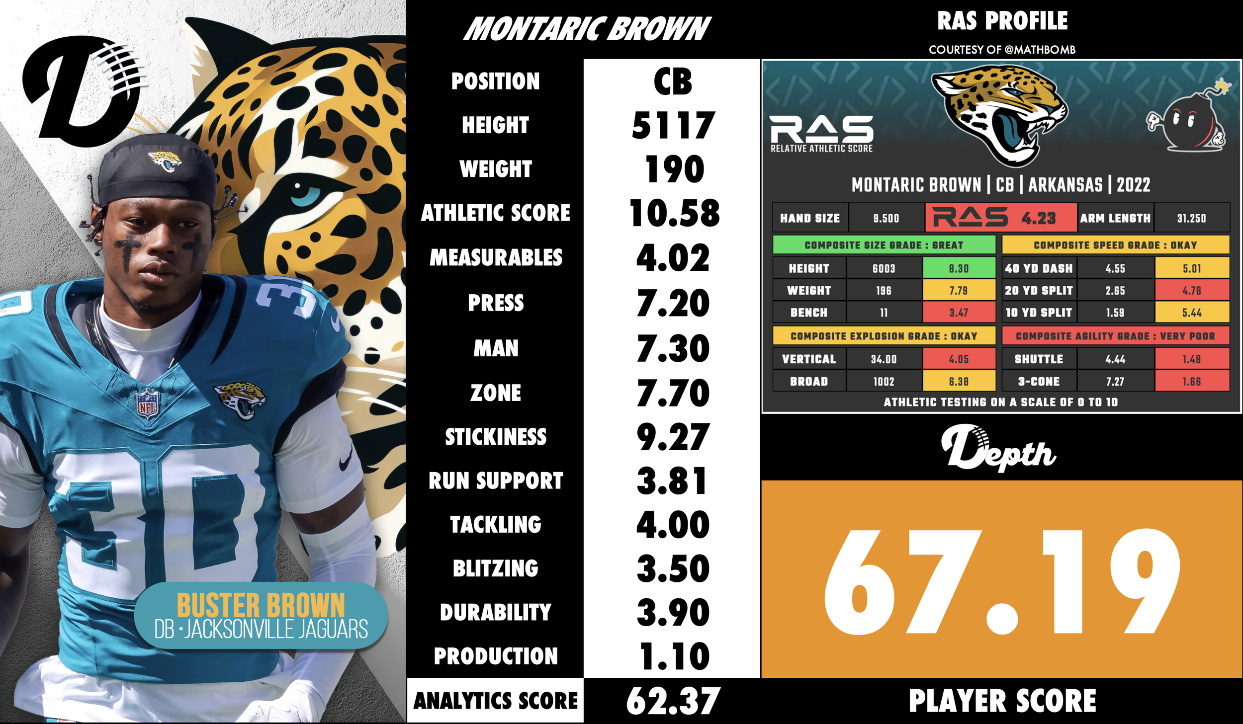 Tackling and physicality for the position: At 190 lbs, Brown shows willingness to get involved in run‑support and make tackles—he recorded 54 tackles in his final college season. In the NFL, he logged 75 total tackles in the 2024 season. Jacksonville Jaguars