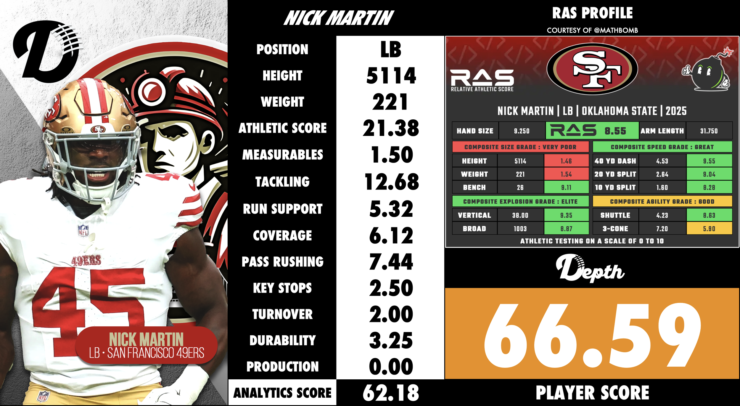Nick Martin is a linebacker selected in the 3rd round (75th overall) of the 2025 NFL Draft by the San Francisco 49ers. San Francisco 49ers A standout at Oklahoma State Cowboys, he led the Big 12 in tackles in 2023 with 140 and earned First-Team All-Big 12 honors. San Francisco 49ers Known for his speed, sideline-to-sideline range and high-motor style, he is viewed as a versatile “chase” linebacker with significant upside. The 33rd Team However, concerns exist around his size, durability (a knee injury cost much of his 2024 season) and transition from college to the pros. San Francisco Chronicle