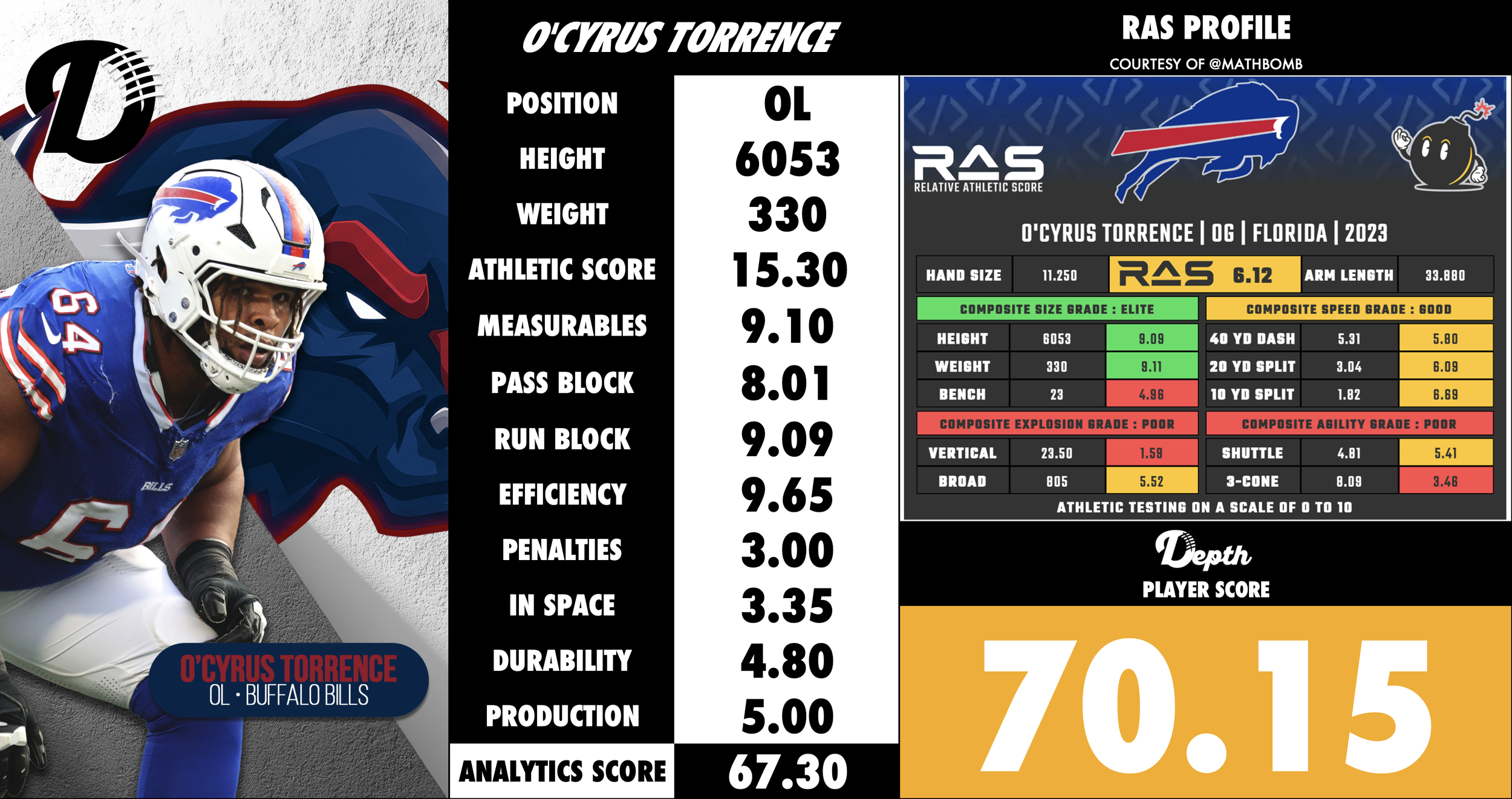 Short‑Term: Expect Torrence to be a full‑time starter at guard, contributing significantly to both the run and pass aspects of Buffalo’s offense. Given his early usage and size, he should be a foundational piece for the Bills up front.