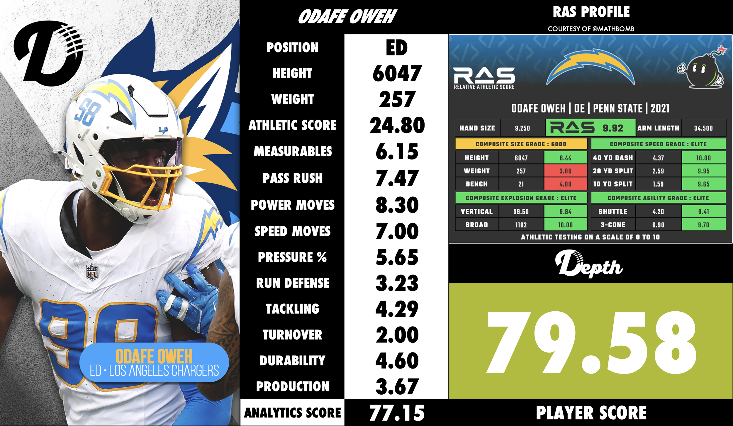 Odafe Oweh projects as a high-upside, situational edge rusher moving forward. With the Chargers, he can be used aggressively as a pass‑rush specialist on obvious passing downs, stunts, and sub‑packages. In an ideal scheme, he won’t be asked to carry 100% of the workload but rather to maximize his strengths — speed, length, burst — in a concentrated role. If he continues building his technique, refines his counter repertoire, and stays healthy, Oweh has the potential to be a double-digit sack guy regularly, especially in passing situations. Over time, he could grow into a foundational piece of a defensive front, but his trajectory depends heavily on coaching and usage.