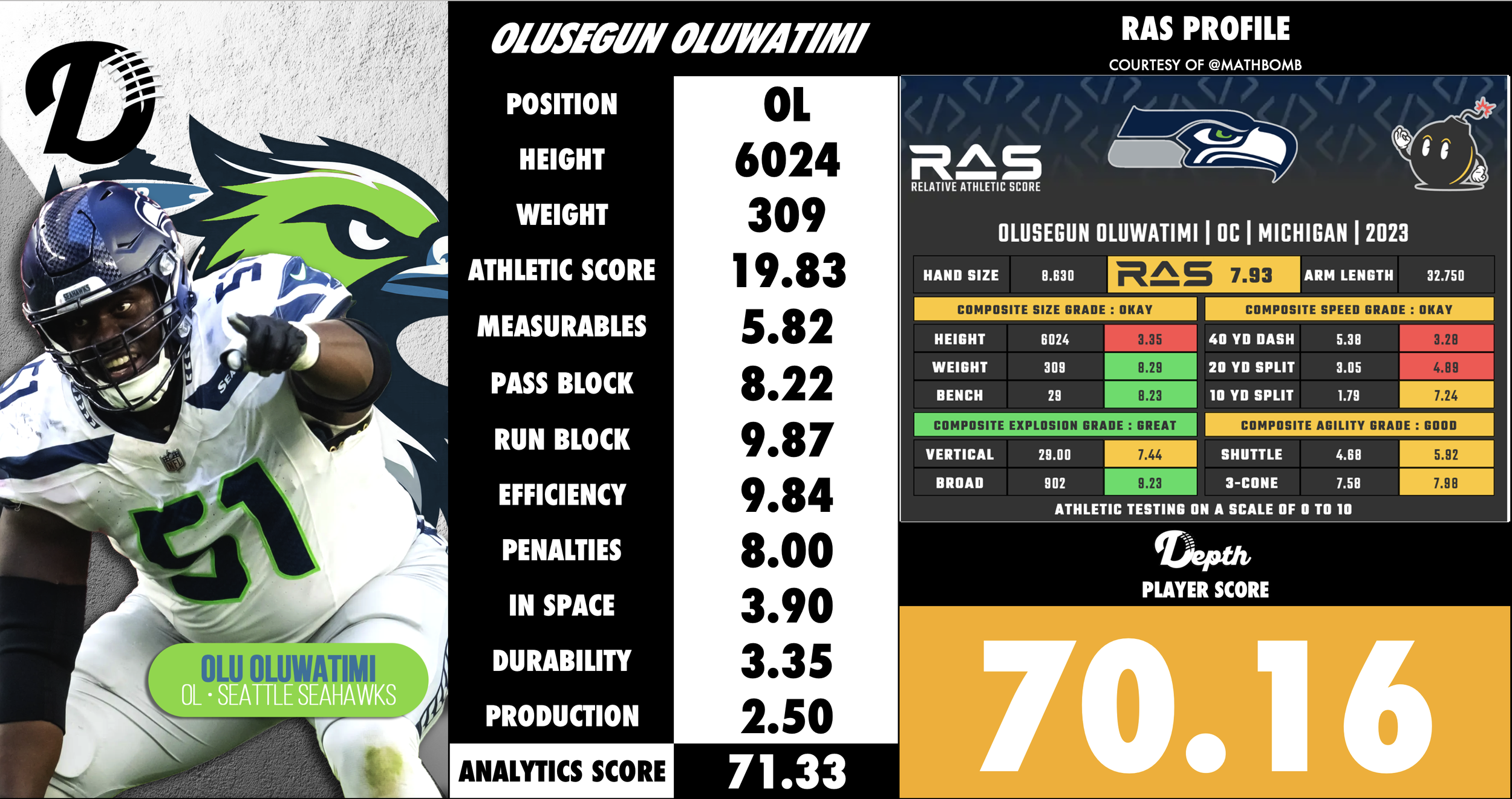 Oluwatimi fits best as a team’s starting center in a scheme that values intelligence, technique, and reliability over sheer brute physical dominance. His ability to process defensive alignments, make calls, and provide steadiness in the middle makes him a strong fit for the Seahawks’ offensive line structure. In the early years of his career, expect him to compete for the starting job and contribute as a high‑quality backup if not immediately the full‑time starter. Over the longer term, if he continues to improve his anchor strength, maintain his technique, and adapt to the increased physicality of the NFL, Oluwatimi has the potential to become a dependable, multi‑year starting center. His floor is solid—a reliable starter; his upside is a long‑term starter who could be viewed as one of the better centers in the league if he refines his technique and compensates for some physical limitations.