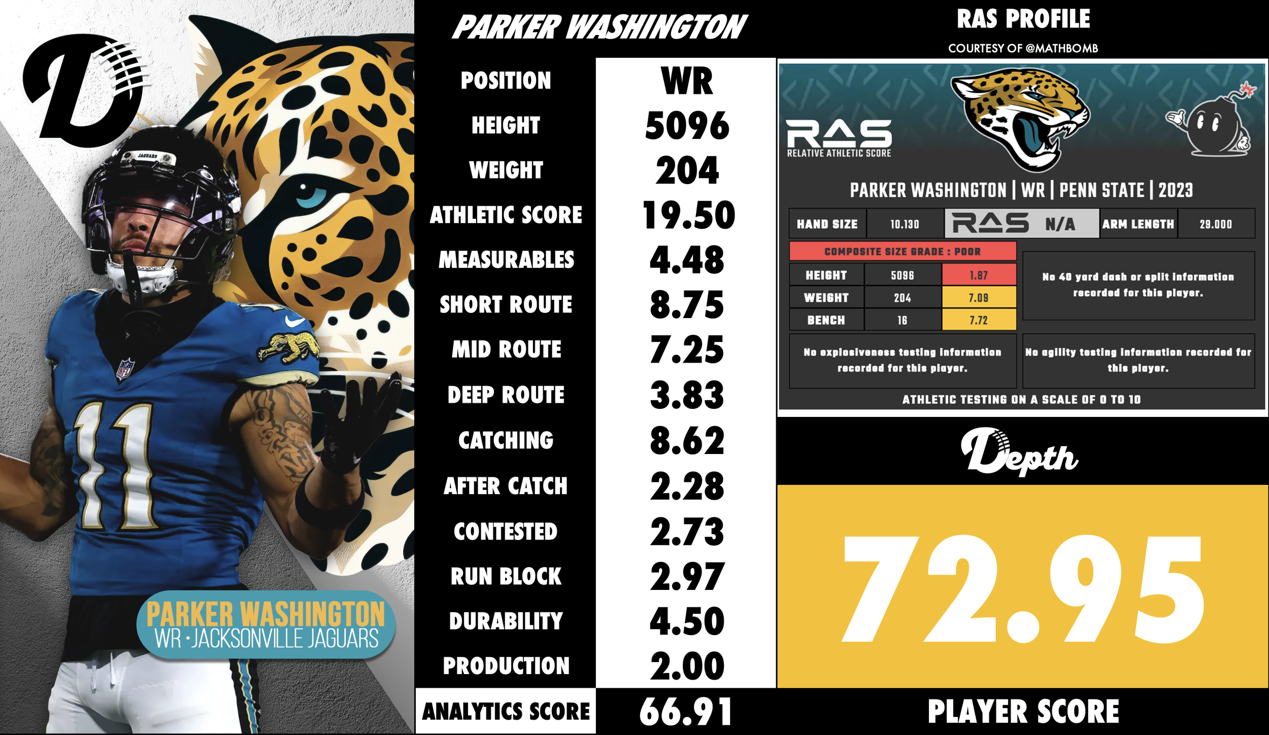 Parker Washington was selected in the 6th Round (#185 Overall) in the 2023 Draft out of Penn State. Washington is a promising young wide receiver with a strong foundation of hands, agility, and YAC ability. His build, contact balance, and versatility give him a good floor. The question marks lie in deep speed, separation against elite coverage, and establishing himself as a high‑volume target. With the right development and opportunity in Jacksonville, he could become a meaningful contributor and potentially grow into a more prominent receiving role.