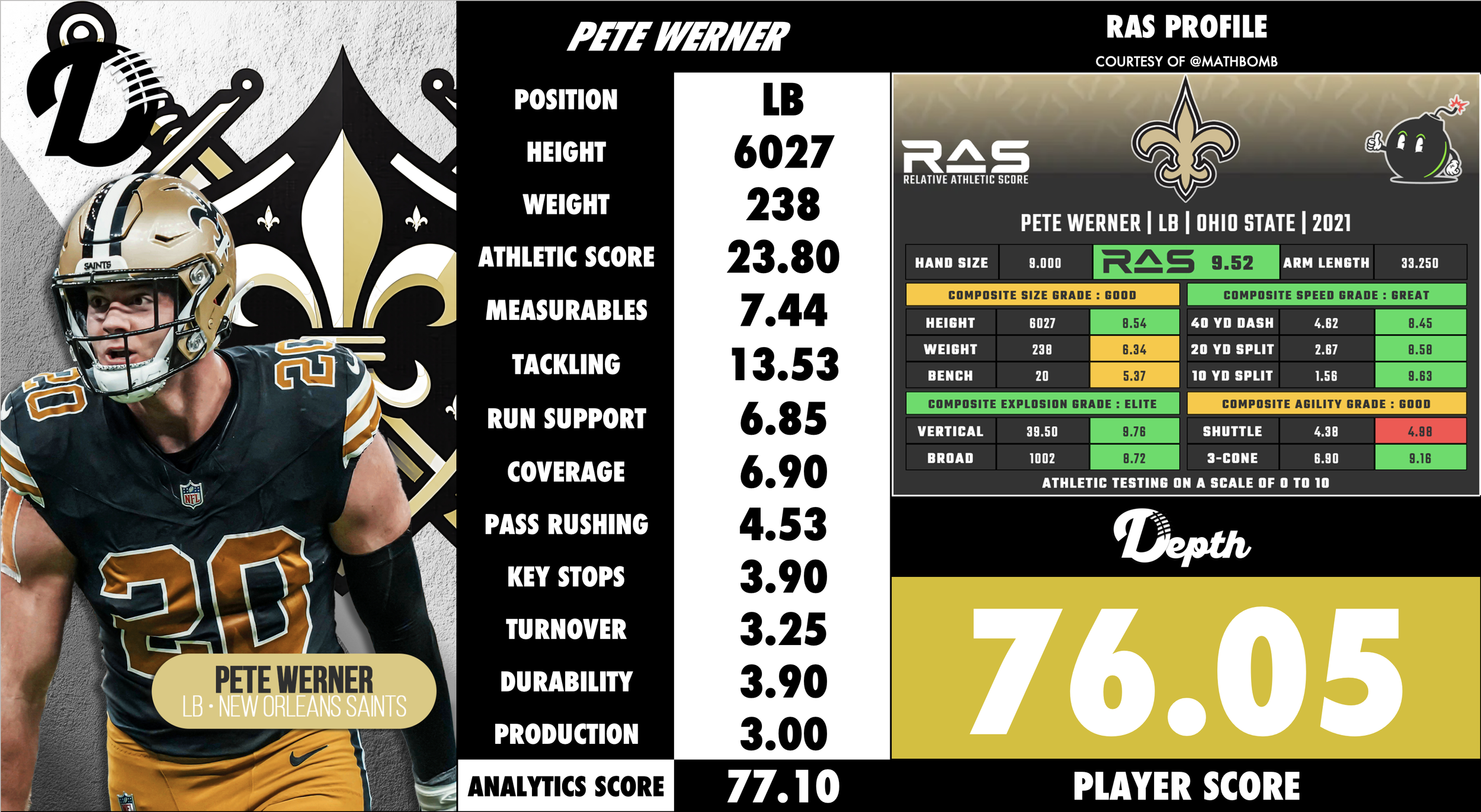Pete Werner was selected in Round 2 (#60 Overall) in the 2021 Draft out of Ohio State University. Werner is a versatile linebacker with a strong multi‑positional background at Ohio State. At approximately 6′3″ and ~242 lbs, he brings size, length, and athleticism that allow him to play in coverage, handle the strong side or weak side, and contribute in run defense and special teams. Scouts have noted his ability to mirror tight ends, drop into space, and shoot gaps in the running game. At the same time, there are questions about his instincts, change‑of‑direction in tight spaces, and ability to consistently disengage blocks at the highest level. His profile suggests a solid starter floor with upside as a three‑down linebacker in the right scheme.