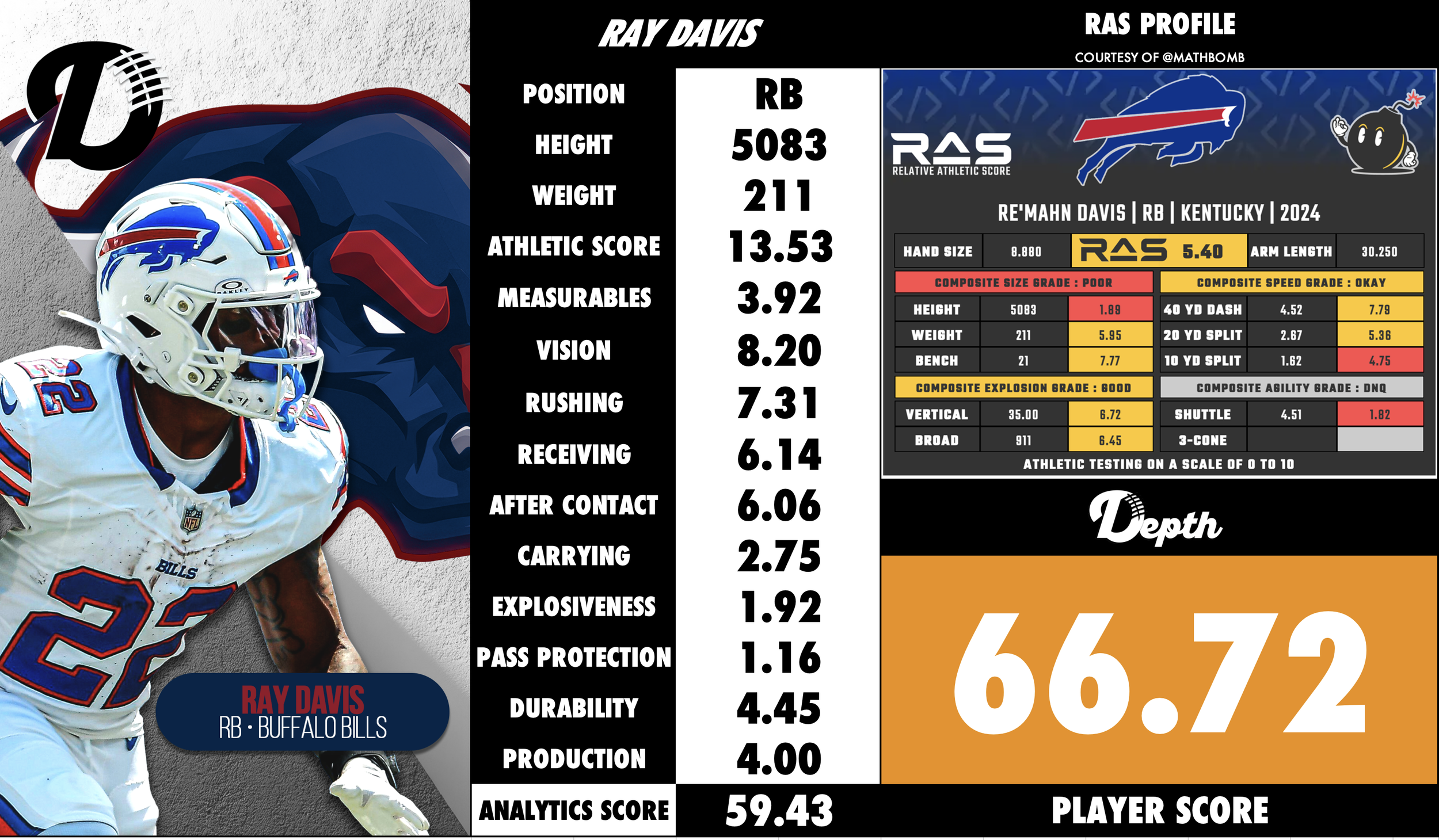 Ray Davis entered the NFL as a player with a compelling story and rising production — overcoming adversity off the field and transferring through multiple colleges before arriving at Kentucky, where he broke out. New York Post Drafted by the Bills in the 2024 NFL Draft, Round 4, (pick 128). Davis transitioned into a backup/rotational role behind lead back James Cook. Even in a secondary role, he showed flashes of big-play ability (e.g., a 63-yard touchdown catch) and efficiency when given opportunities. Buffalo Bills