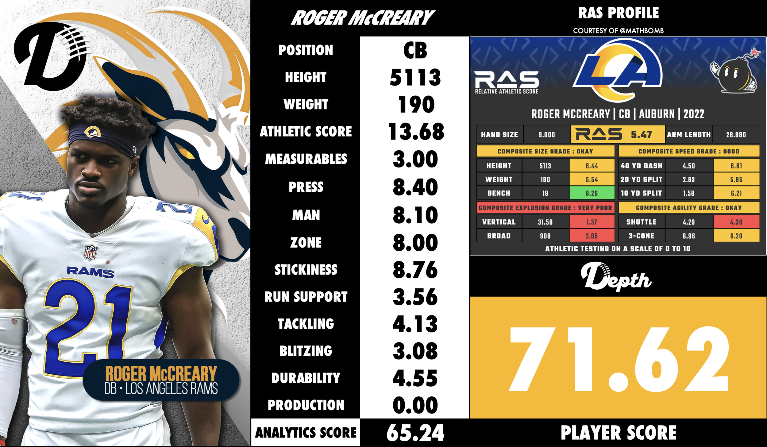 Roger McCreary was selected in Round 2 (#35 Overall) in the 2022 Draft out of Auburn University. McCreary entered the league as a technically polished and highly competitive cornerback with experience across press‑man, off‑man, and zone coverages at Auburn. While his measurables (arm length, long‑speed) were considered less than ideal, his tape showed fluid hips, quick feet, strong ball‑skills and a willingness to mix it up in run support. His projection was as an immediate starter or early contributor who might excel in match‑up or sub‑package roles, with upside as a full‑time starter depending on scheme fit and development.