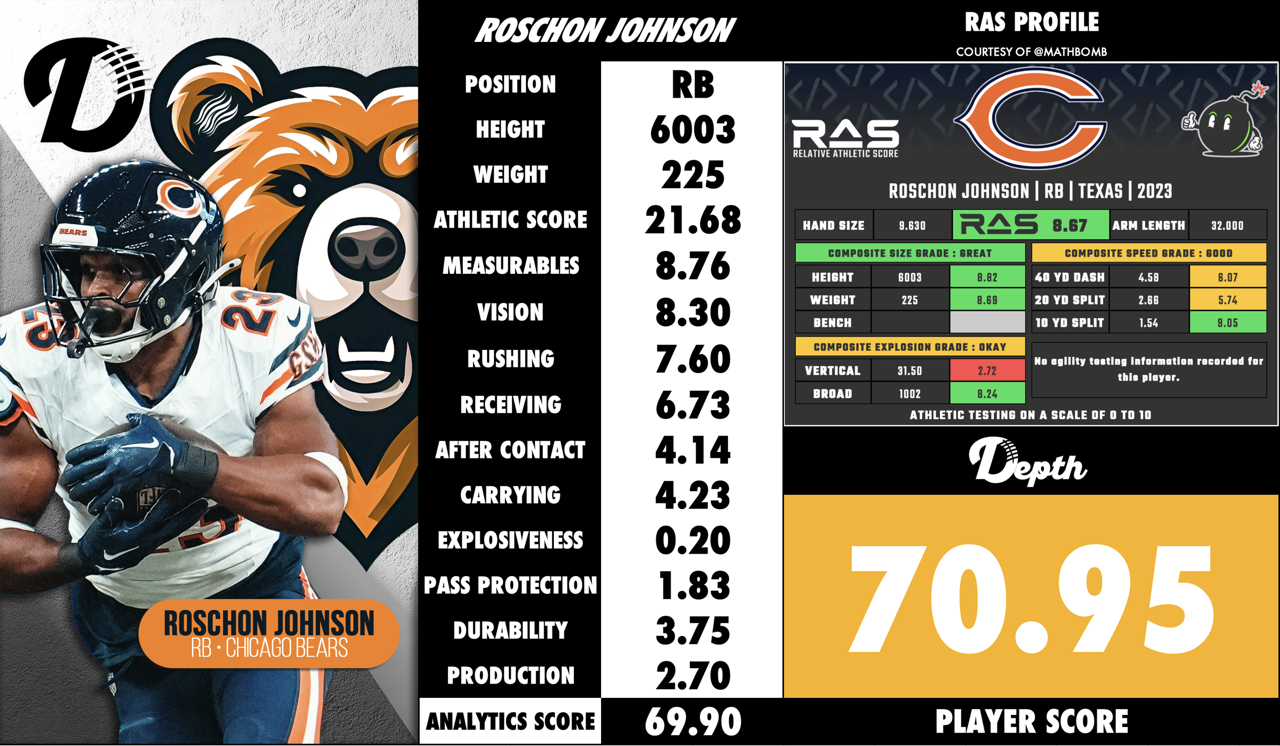 Roschon Johnson is a running back for the Chicago Bears (NFL), drafted in the 4th round (115th overall) of the 2023 NFL Draft from the Texas Longhorns.NFL Draft Buzz