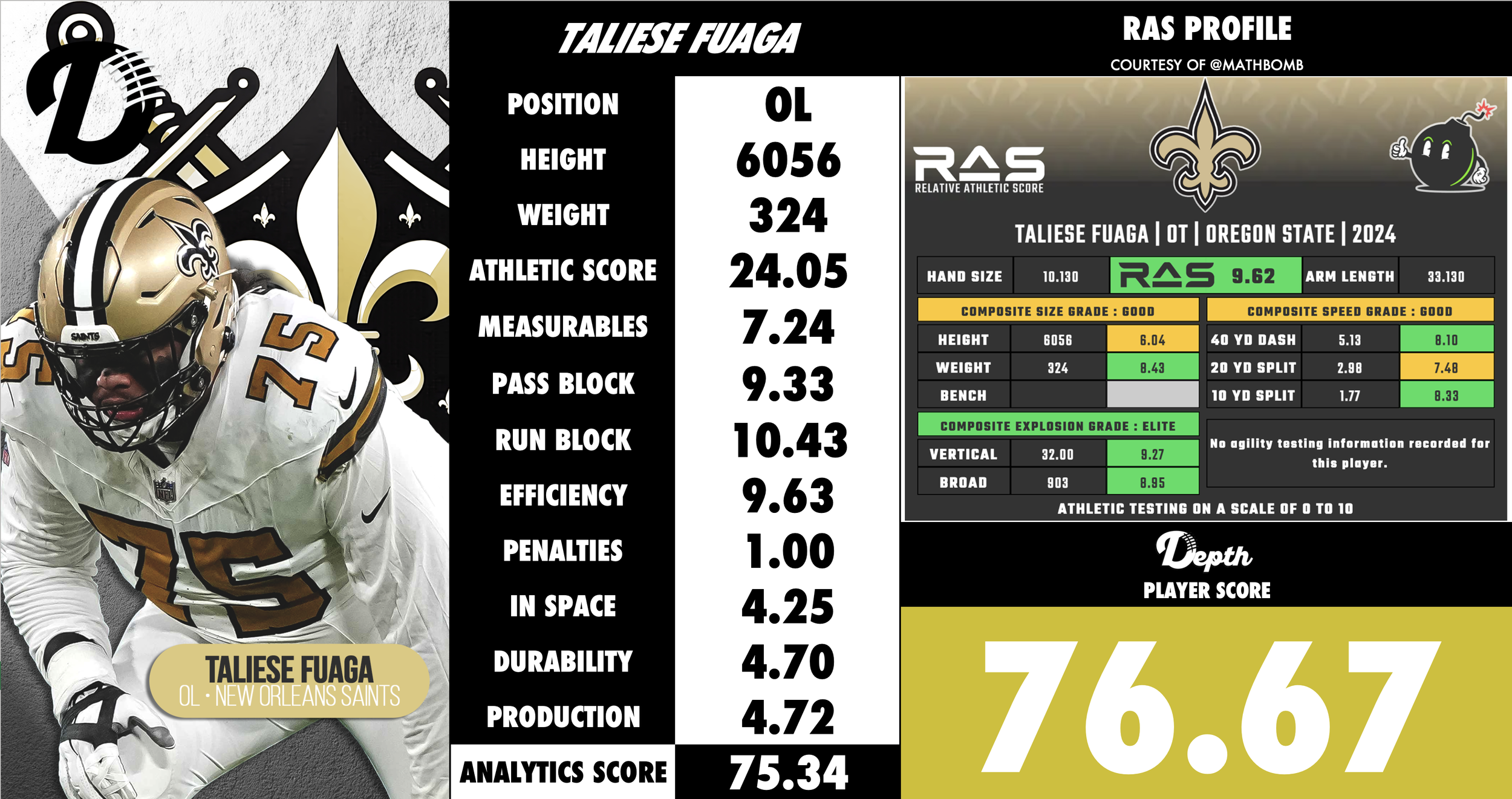 Taliese Fuaga was selected in Round 1 (#14 Overall) in the 2024 Draft out of Oregon State University. Fuaga is a highly promising young offensive lineman whose standout strengths are size, power, movement ability, strong fundamentals in run and pass blocking, and positional versatility. His main growth areas lie in maximizing his reach and leverage in edge matchups, improving lateral agility and hip transitions, anchoring fully in the most physical pass‑rush scenarios, and adapting to left tackle or high‑pressure reps if required. If he develops as projected, he can be a foundational tackle for years to come.