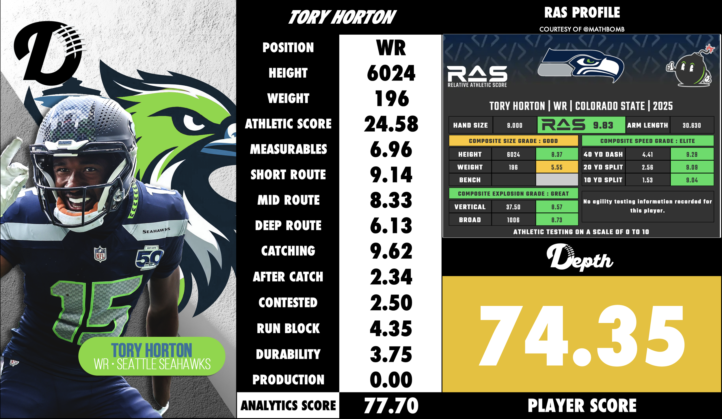 Tory Horton was selected in the 5th Round (#166 Overall) in the 2025 Draft out of Colorado State University. Horton is a dynamic young wide receiver with a strong blend of speed, length, and route‑running feel. His major strengths lie in his ability to stretch defenses, track deep passes, and produce chunks of yardage, while also contributing in the return game. His biggest developmental tasks are adding physical strength, improving his release and contested catch consistency, and proving durability. In the right offensive system, he can be a difference‑maker; his transition to being an every‑down impact receiver will depend on refining the aforementioned areas.