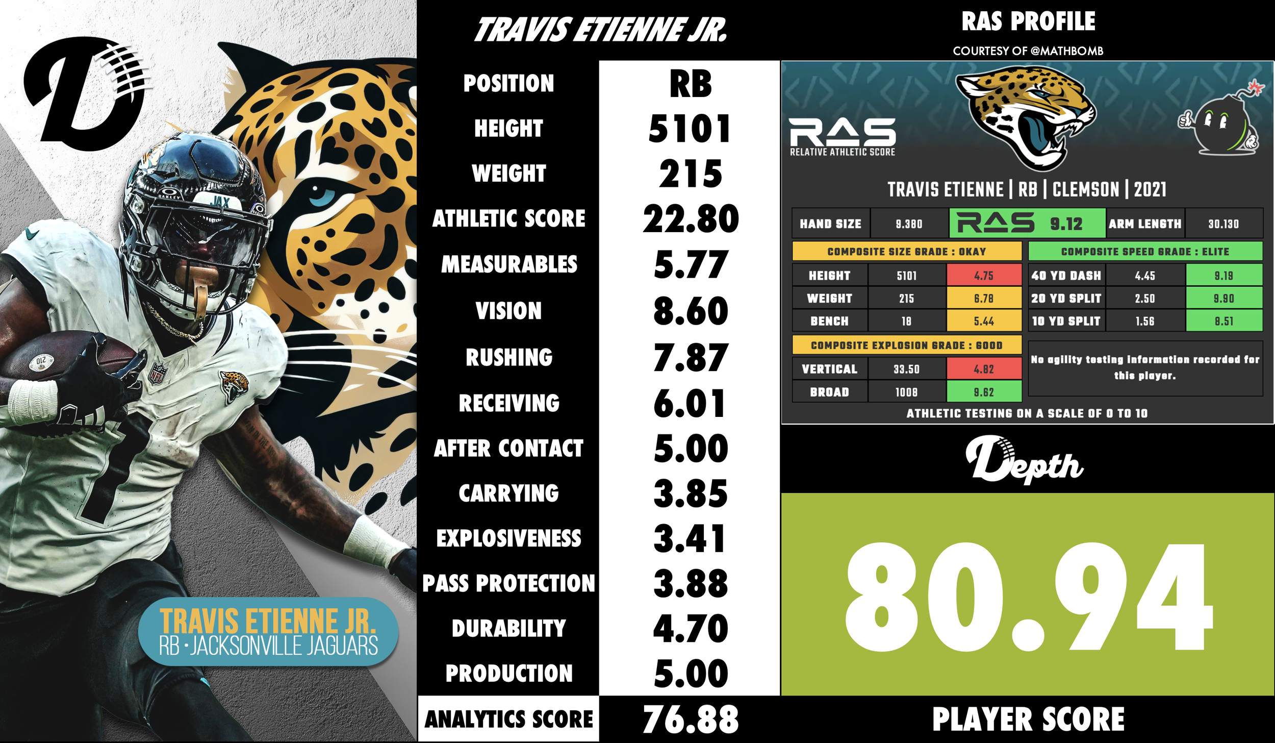 Shorter stature and physicality limitations: At 5′10″/215 lbs, Etienne is not the biggest back in terms of size and may face challenges with power runs, bumped blocks, or when asked to be a pure between‑the‑tackles load carrier. The Draft Scout