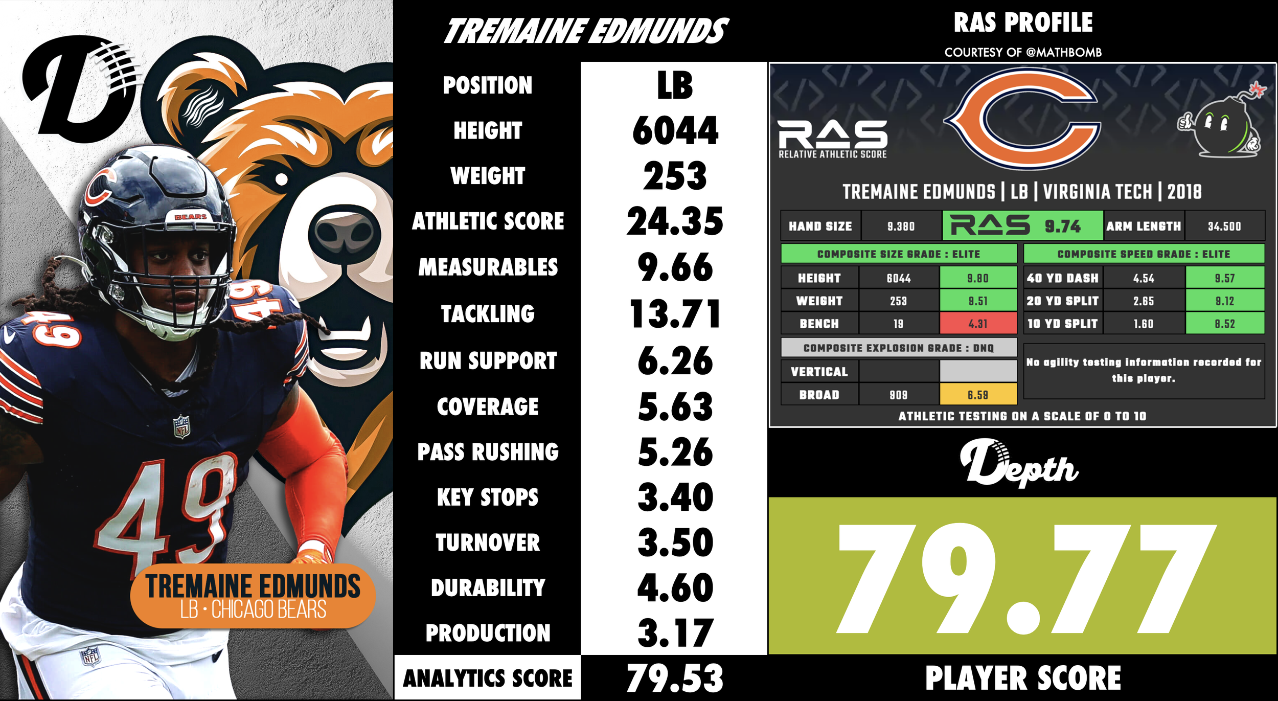 Athleticism & range: Edmunds moves exceptionally well for his size—he has sideline-to-sideline speed, agility in space, and closing speed to make plays once he diagnoses the action. theScore.com