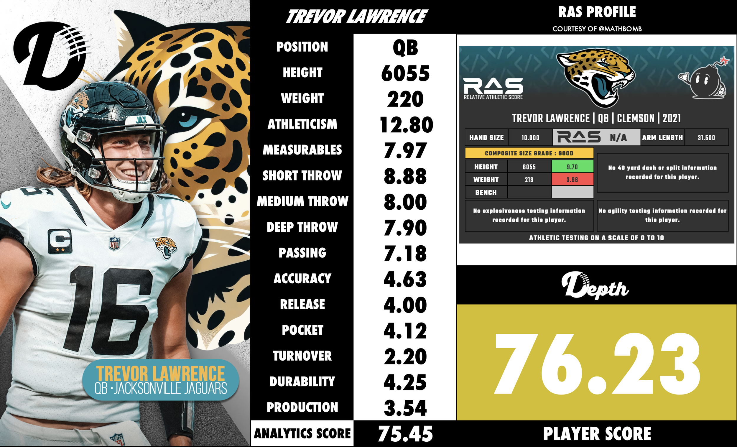 Trevor Lawrence was selected in the 1st Round (#1 Overall) in the 2021 Draft out of Clemson University. Lawrence is a highly talented quarterback with elite physical traits, strong deep-ball ability, and significant upside. His strengths give him the potential to be among the best in his position. However, the translation of that potential into consistent elite production has been hindered by mechanical inconsistencies, pocket management issues, and the broader team/system context. If he can continue to develop his game, improve the supporting environment, and stay healthy, he has the tools to reach—and perhaps exceed—the expectations set for him.