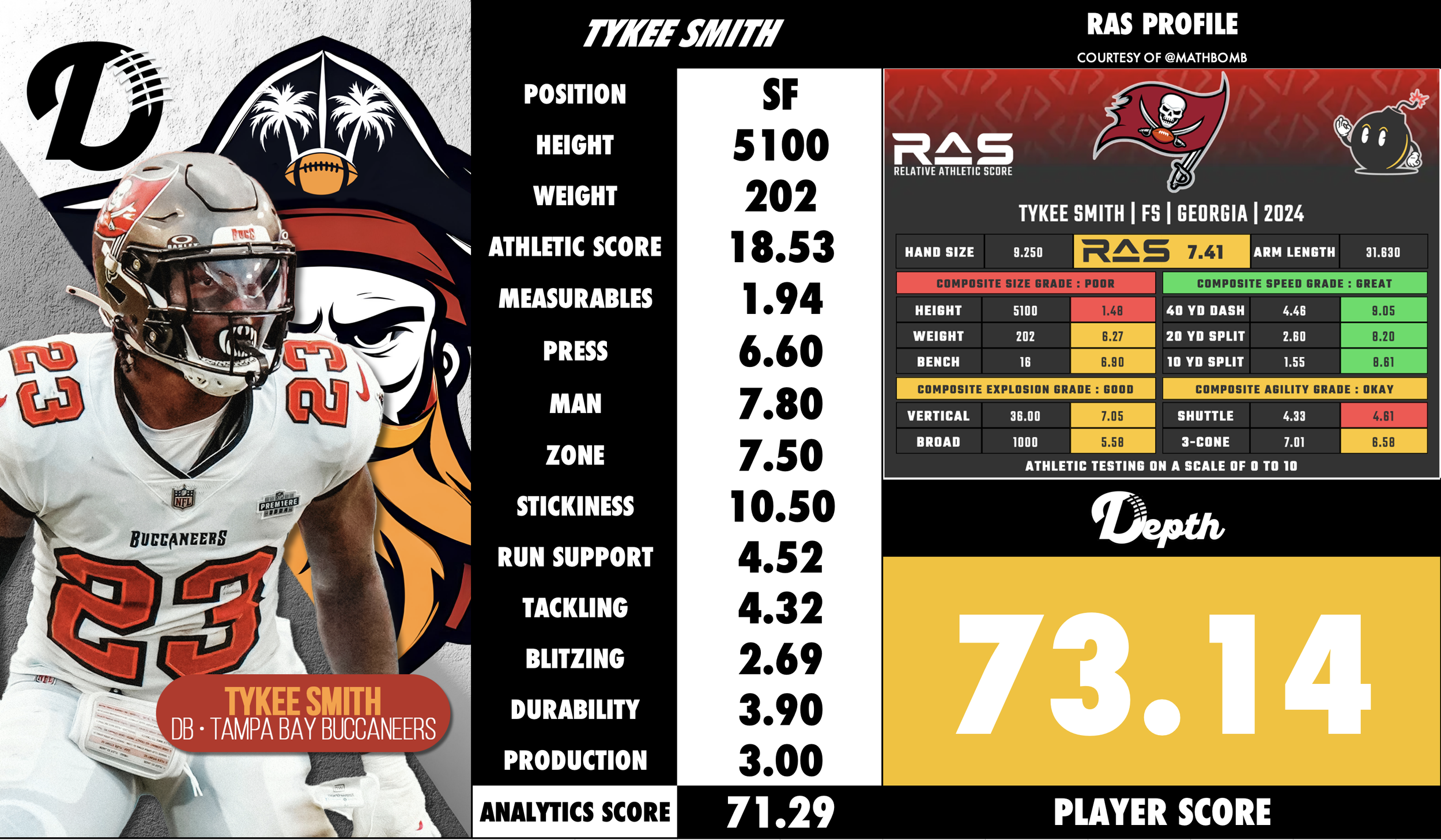 Tykee Smith was selected in the 3rd round (89th overall) of the 2024 NFL Draft by the Tampa Bay Buccaneers. Inquirer.com He played college football at Georgia (after transferring from West Virginia), where in his final season (2023) he totaled 70 tackles, 8.5 tackles for loss, and 4 interceptions, earning Second‑Team All‑SEC honors. Inquirer.com During his college career, he was used in a hybrid “STAR” role — a nickel/safety-type defender who played near the box and in coverage. Inquirer.com He signed his rookie contract with Tampa Bay in May 2024. Tampa Bay Buccaneers Known for his versatility, physicality, and instincts, Smith brings a strong football IQ, leadership, and a willingness to mix in the run game. SI