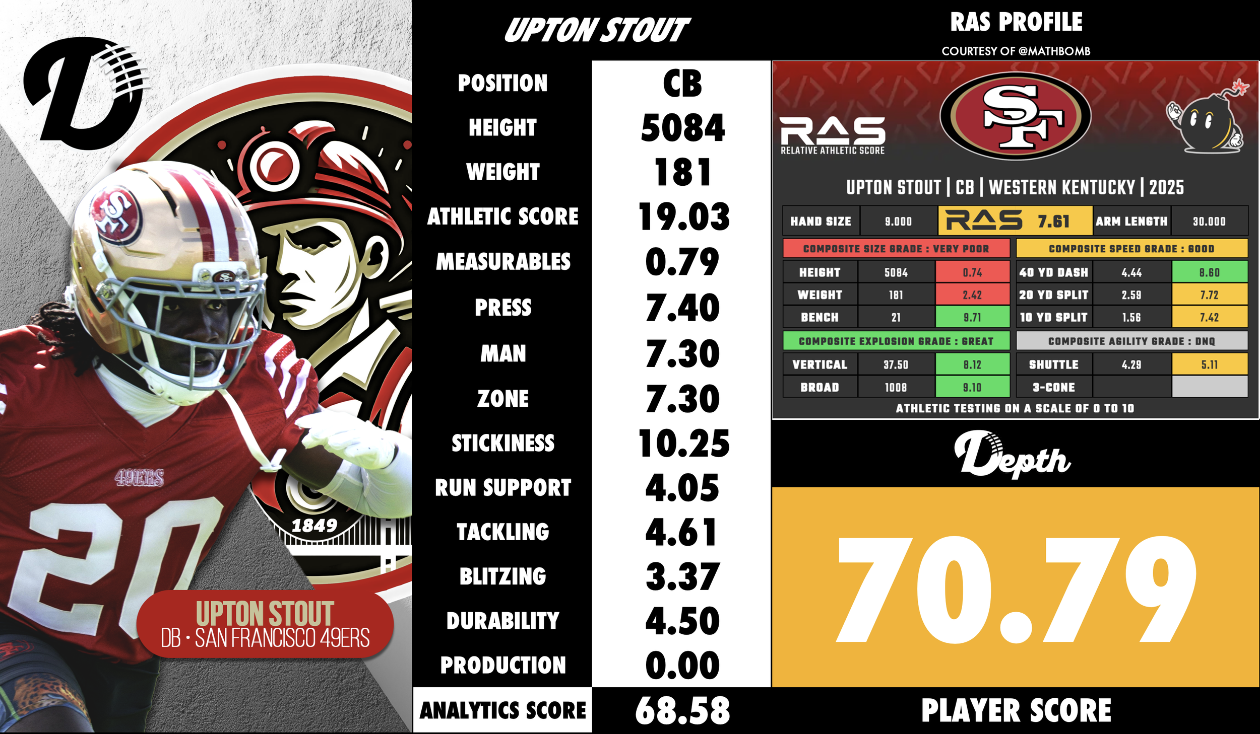 Upton Stout is a highly competitive, instinctive young cornerback who has built his reputation on playmaking, toughness, and film study rather than pure size or elite length. After beginning his college career at North Texas, where he saw action early as a freshman, he transferred to Western Kentucky. At WKU he developed into one of the most productive cornerbacks in Conference USA — finishing his final season with 52 tackles, 7.5 tackles for loss, a sack and an interception, earning First-Team All-CUSA honors. Western Kentucky University Athletics