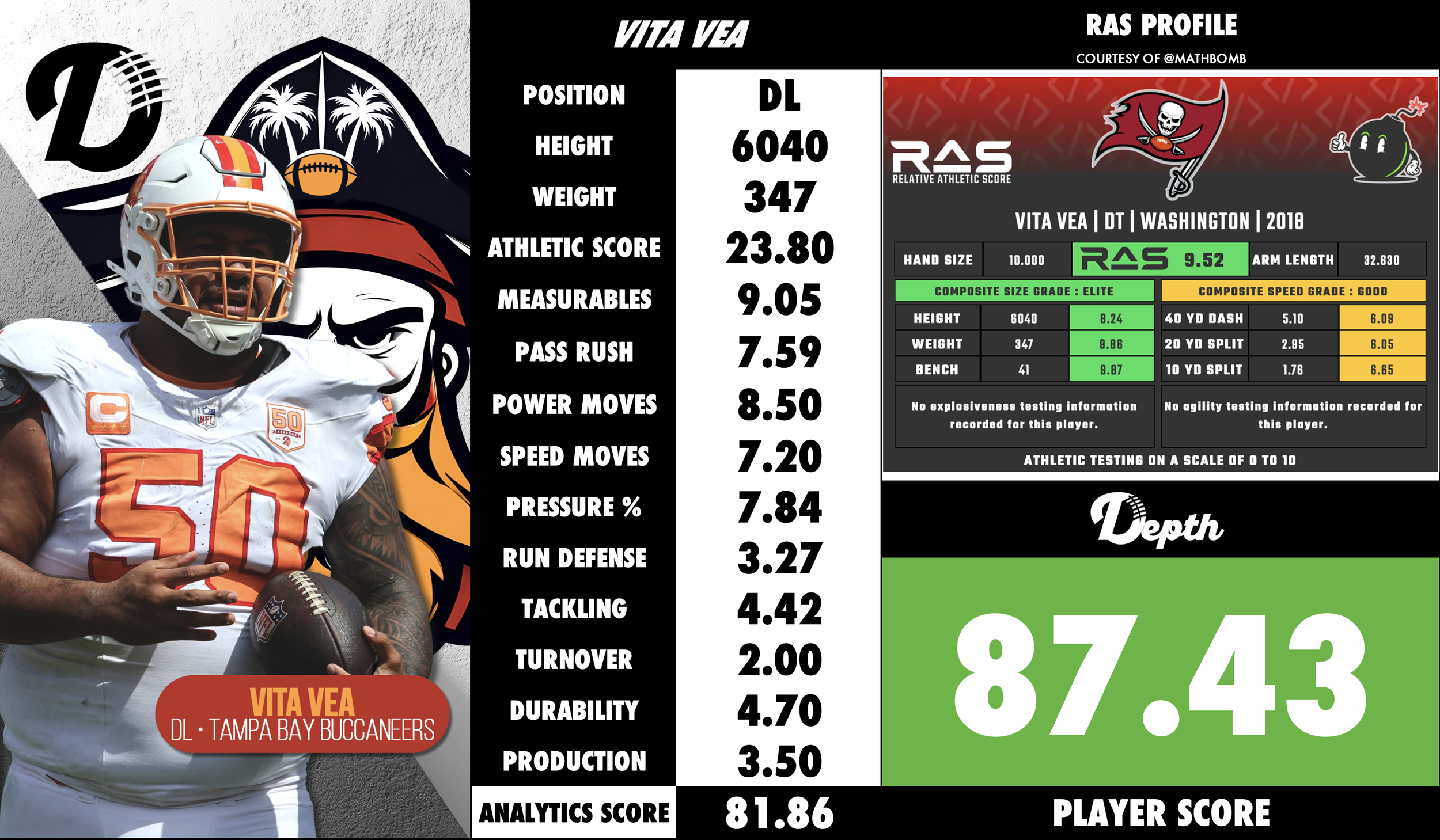 Tremendous Size + Power: At ~347 lb, Vea is a truly massive interior force. ESPN.com
