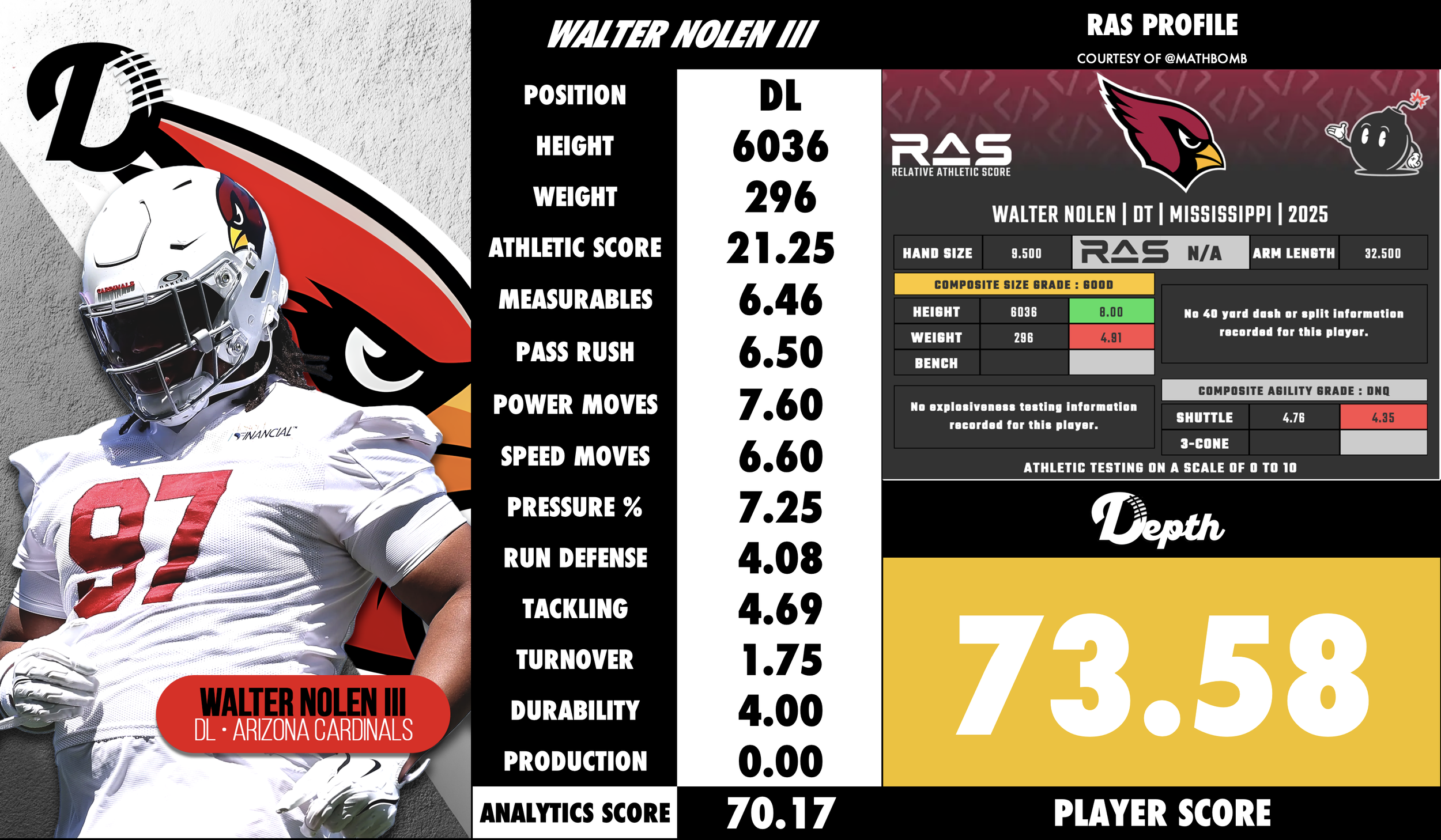 Walter Nolen III projects as a high-upside disruptor at defensive tackle or defensive end (depending on scheme) who can be a focal point of an attacking defense. His explosion, strength, and motor make him ideal in a 3‑technique role in one-gap fronts, particularly in schemes that prioritize penetration and backfield disruption. For the Arizona Cardinals, Nolen brings a young, powerful presence to the interior defensive line — if he stays healthy and refines his craft, he has the potential to become a versatile three-down lineman. His ceiling is as a game-wrecker, though it may take a few seasons to fully harness his physical gifts into consistent dominance at the pro level.