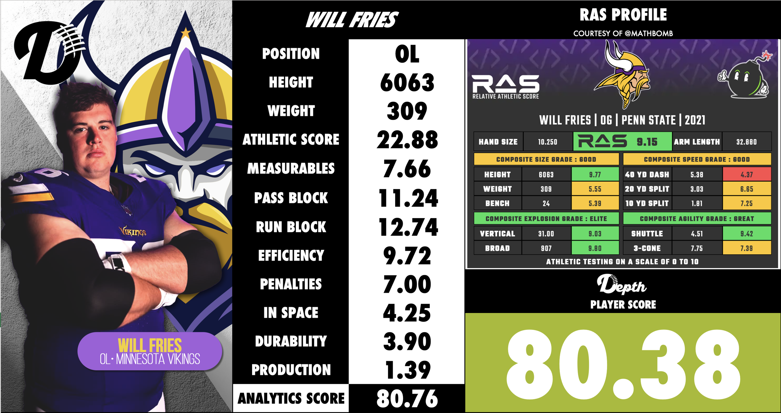 Will Fries was selected in the 7th Round (#248 Overall) in the 2021 Draft out of Penn State. Fries is a promising and improving NFL guard who has overcome being a late‑round pick to become a trusted contributor and get a major contract. His strengths include his size, improvement trajectory, low error/blown‑block rate, and starting experience. His key challenges are health/availability, further refinement to dominate rather than just perform, and stepping up to elite guard status. If all goes well, he has the potential to anchor an interior offensive line for years; if not, he still offers strong value as a starter.