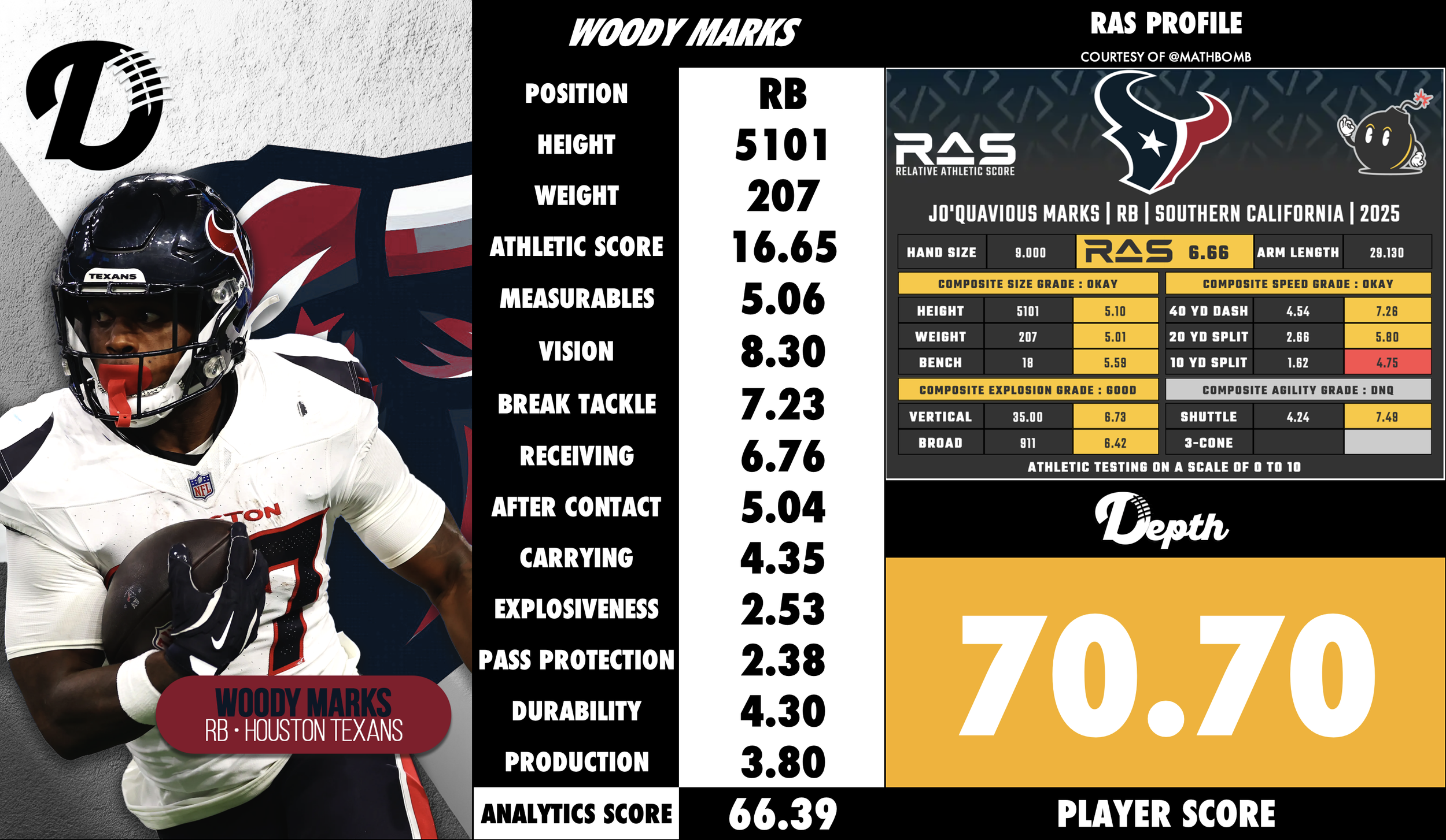 Woody Marks was selected in the 4th Round (#116 Overall) in the 2025 Draft out of University of Southern California (USC). Marks enters the NFL as a multi‑dimensional running back known for his receiving chops out of the backfield and strong production in college—both as a rusher and receiver. His college résumé features over 3,000 rushing yards and more than 1,500 receiving yards. While he may not have elite breakaway speed, his skill set suggests he can contribute early, especially in an offense that values passing‑game backs. The key for his long‑term success will be how well he evolves his power‑running game, pass‑protection skills, and ability to create “big‑play” runs. If he does so, he could become a modern three‑down back; if not, he may serve best as a high‑end complement.