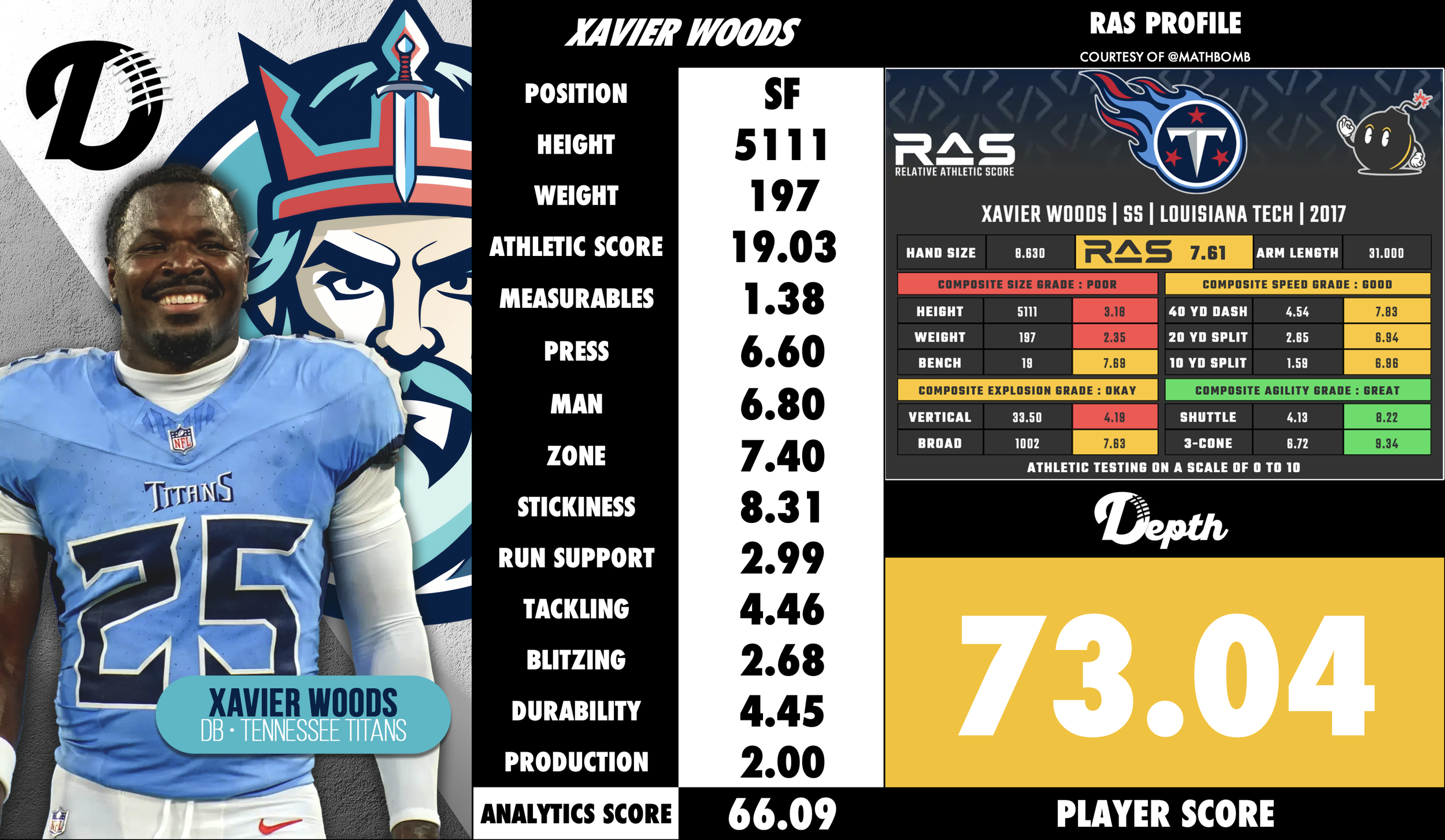 Xavier Woods was selected in the 6th Round (#191 Overall) in the 2017 Draft out of Louisiana Tech University. Woods is a veteran free/strong safety known for his instincts, play‑making ability, and consistent tackling production. He has logged over 100 starts in his NFL career and brings leadership and experience to the back end of a defense. While he may not possess elite size or top‑tier athleticism for every role in coverage today’s NFL demands, his strengths make him a very solid starter in a safety duo, particularly in a scheme that values intelligence, positioning, and versatility.