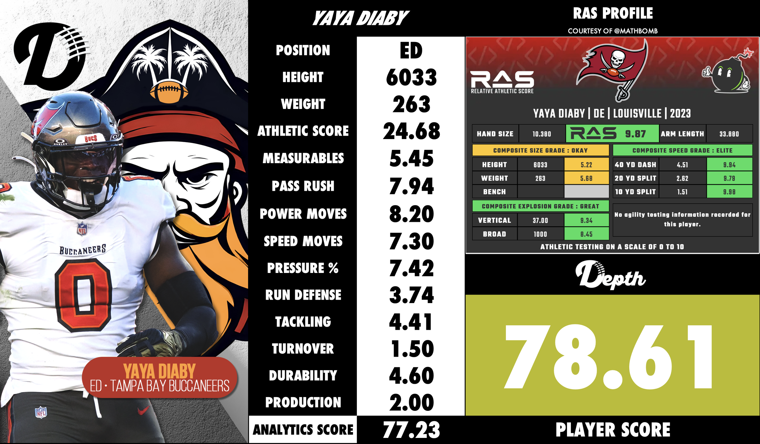 YaYa Diaby was selected in the 3rd round (82nd overall) of the 2023 NFL Draft by the Tampa Bay Buccaneers. Tampa Bay BuccaneersHe played college football at Louisville, following two seasons at Georgia Military College. During his final season at Louisville (2022), Diaby produced 37 tackles, 14.5 tackles for loss, and 9.0 sacks, earning Third-Team All-ACC honors. SI Known for his relentless motor, elite explosiveness, and physicality, Diaby brings a high-upside developmental edge-rusher profile. Tampa Bay Buccaneers His character is highlighted by perseverance—he has spoken about his journey from being a zero-star recruit to making a significant impact in the NFL. Tampa Bay Buccaneers