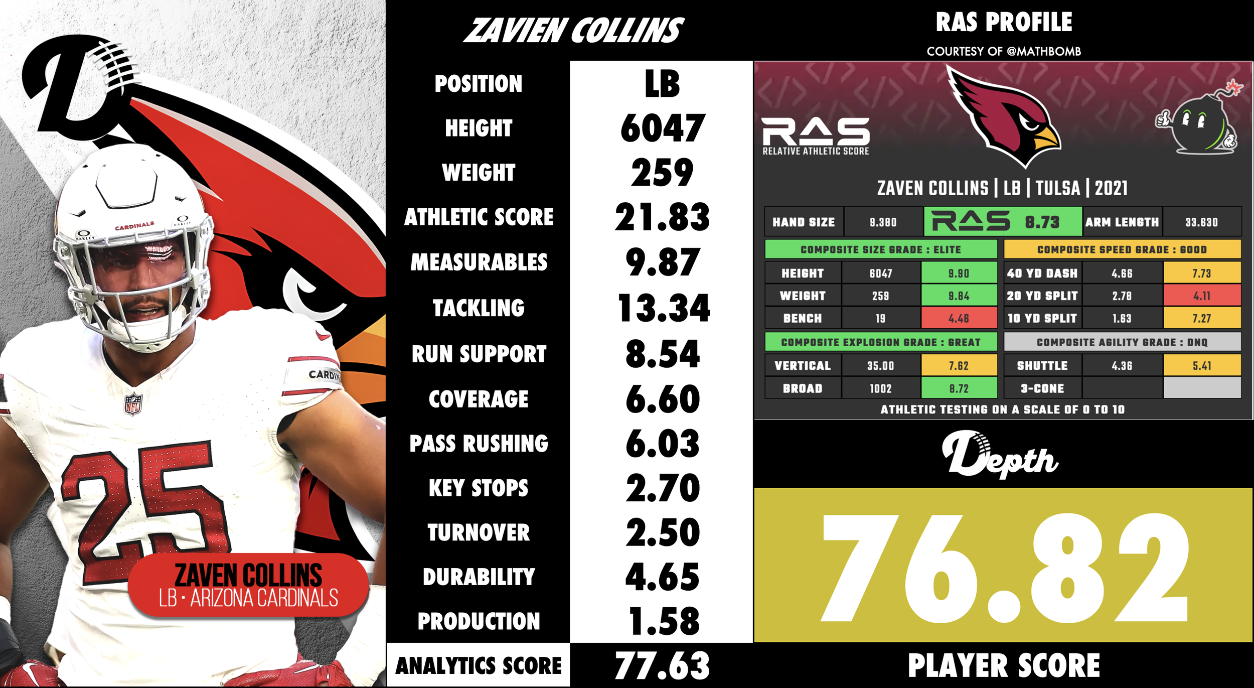 Zaven Collins was selected in the 1st round (16th overall) of the 2021 NFL Draft by the Arizona Cardinals. Arizona Cardinals He played college football at Tulsa, where in 2020 he won the Bronko Nagurski Trophy, Chuck Bednarik Award, and Lombardi Award as the nation’s top defensive player.KOCO In his NFL career so far, Collins has been durable and productive: per the Cardinals, he’s played in 67 of a possible 68 games through 2024, with 223 tackles, 10.5 sacks, 13 pass deflections, 3 forced fumbles, and 2 interceptions. Arizona Cardinals Known for his rare size/length, sideline‑to‑sideline speed, and three‑down versatility, Collins combines physical traits with a strong football IQ, leadership, and a high motor. Athlon Sports
